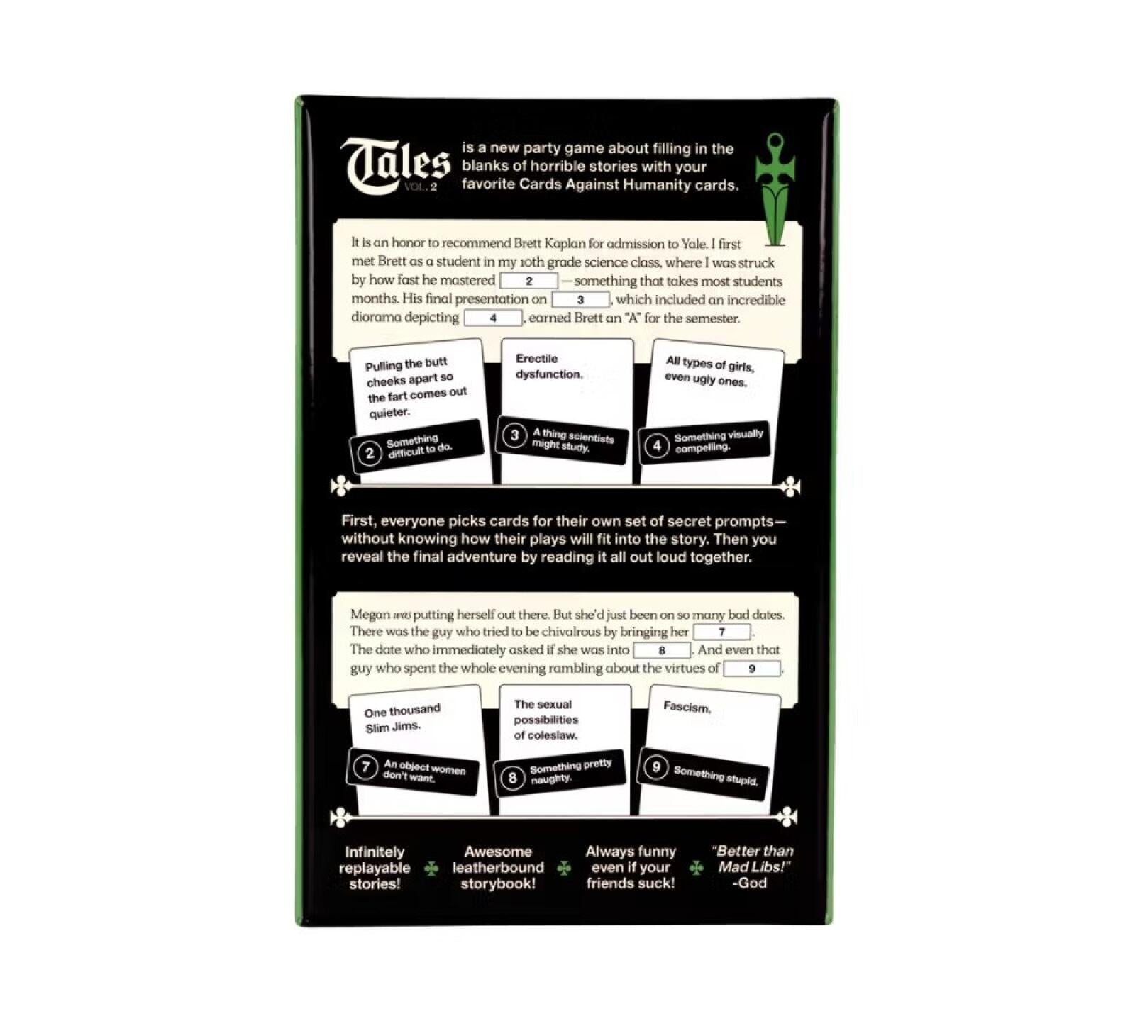 Tales Vol. 2 is a new party game where you fill in the blanks of horrible stories using CAH white cards. It’s the sequel to Tales Vol. 1!