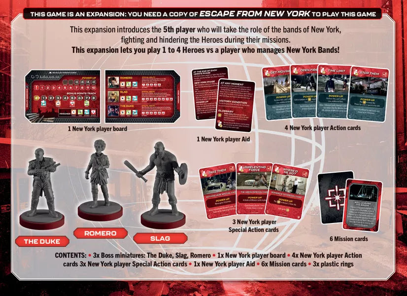 The Bands of New York expansion is played by replacing the New York bot with an actual player, which brings the allowed number of players up to 5. The more the Heroes will make noise, the more cards New York will be able to play - and the stronger they will be.