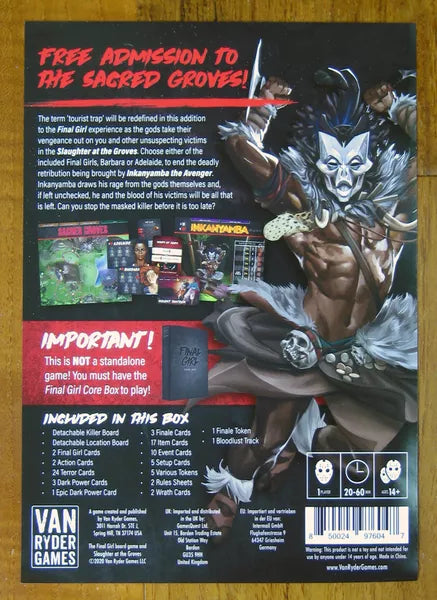 Each year, thousands of tourists flock to the "Ancient Groves" in Africa to see ancient and beautiful settings, artifacts, and places of worship. Vacations turn to nightmares when the masked killer, Inkanyamba, arrives to exact revenge on behalf of the gods. Slaughter in the Groves is produced by Evan Derrick with scenes by talented Director of Photography Tumo Mere.