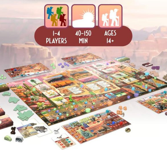 Players will call upon the legendary Jackalope and Lost Dutchman to aid in their travel. Turn order is determined for each round of travel and actions through a unique movement and observation mechanism. Players will need to acquire an interesting blend of key Natural and Personal resources to obtain advantages and create their own mural of Arizona wonders through efficient placement of polyomino depictions.