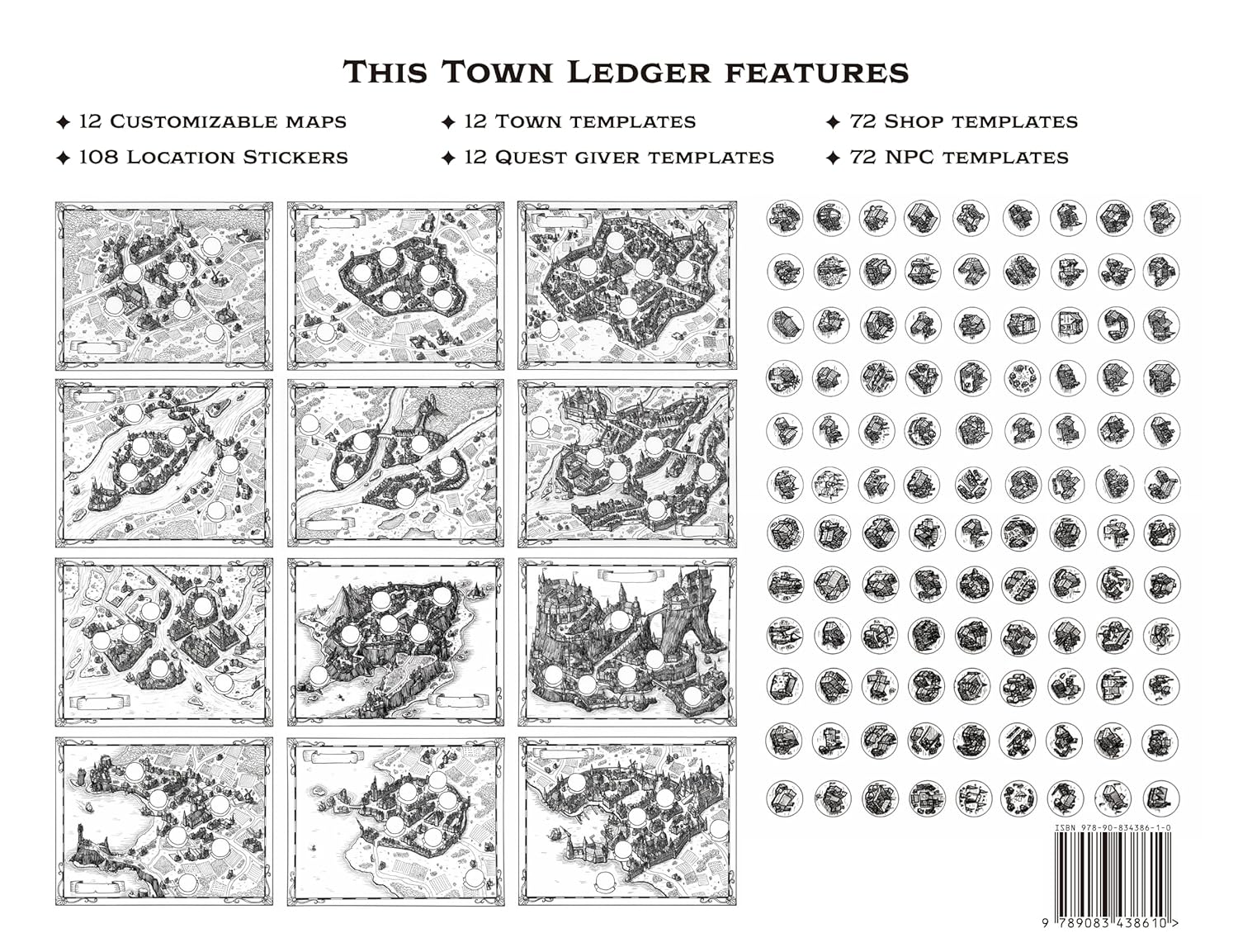 Customize each of 9 hand drawn maps with more than 50 different location stickers! Each town comes with its own town template which allows you to describe the look, culture, history, notable events and other important information.