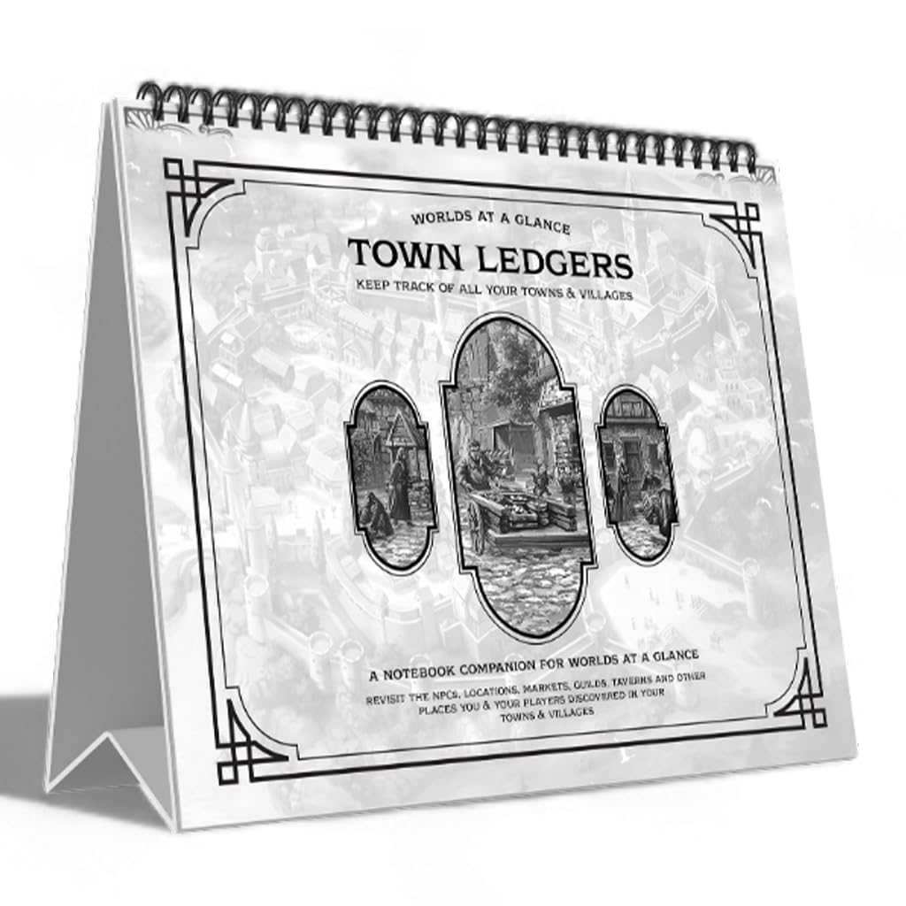 A two paneled display shows the party the town on one side, while keeping town information and details accessible to the DM. The town ledger notebook can stand upright to display maps or can be laid flat to take notes!